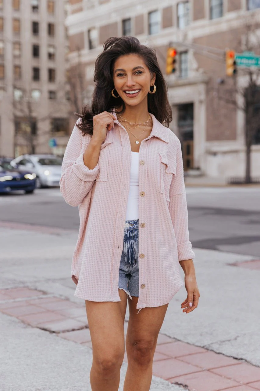 This waffle knit shacket is high on our list of favorites! It's also available in TWO other colors: Black & Taupe! It features an ultra lightweight and comfy waffle knit fabric designed in an oversized button-down shirt silhouette, exposed trim and seaming detail, and front chest flap pockets. Layer it over a solid white tank with denim shorts and nude slip-on sandals for the trendiest casual everyday outfit!