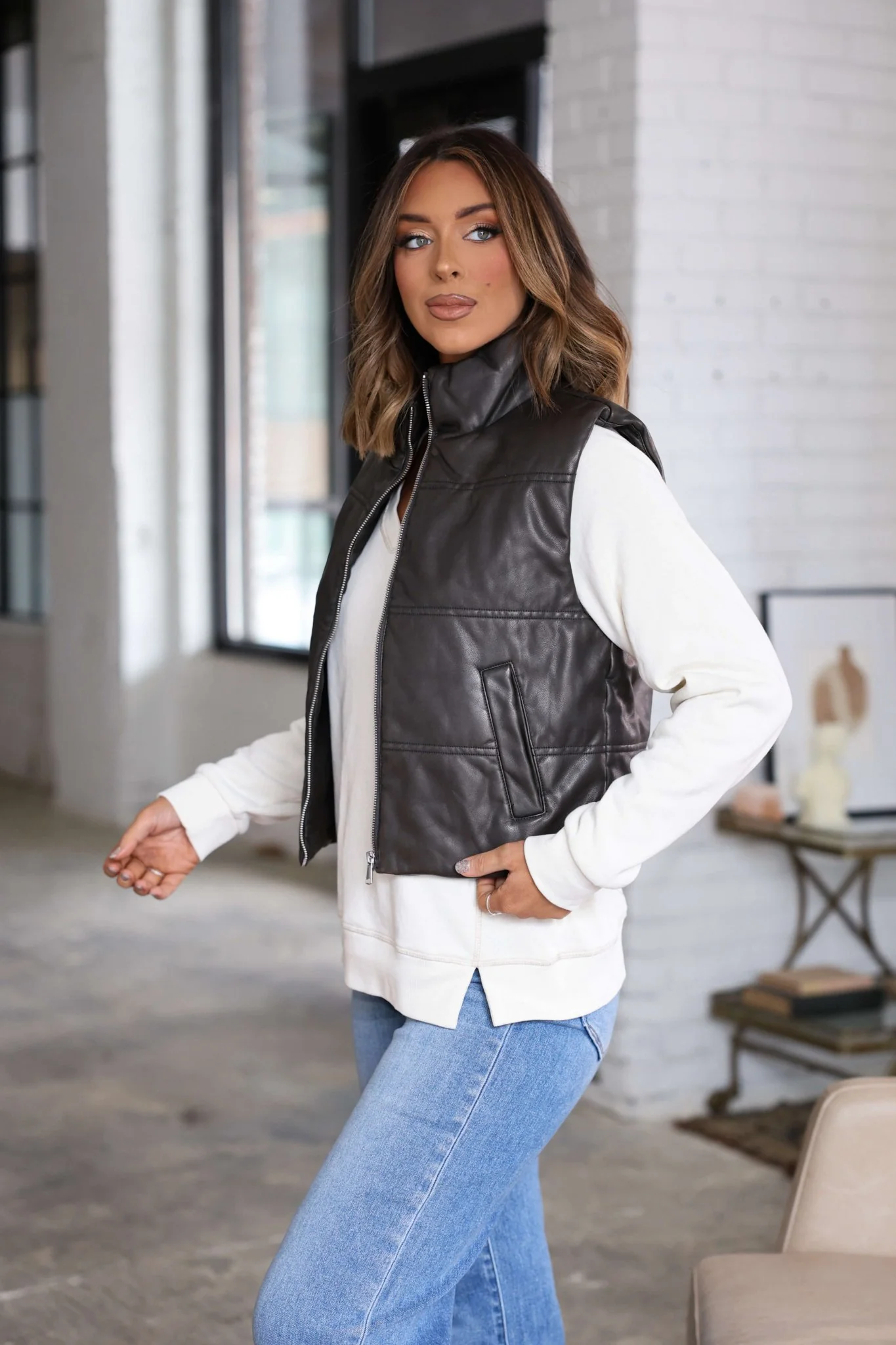 Elevate your outerwear with the Brown Faux Leather Puffer Vest, a chic blend of modern style and cozy comfort. Featuring a funnel neckline, zip-front closure, and side welt pockets, this cropped puffer design adds a bold edge to any look. Crafted from sleek faux leather and fully lined, it’s the perfect statement layer for transitional weather.