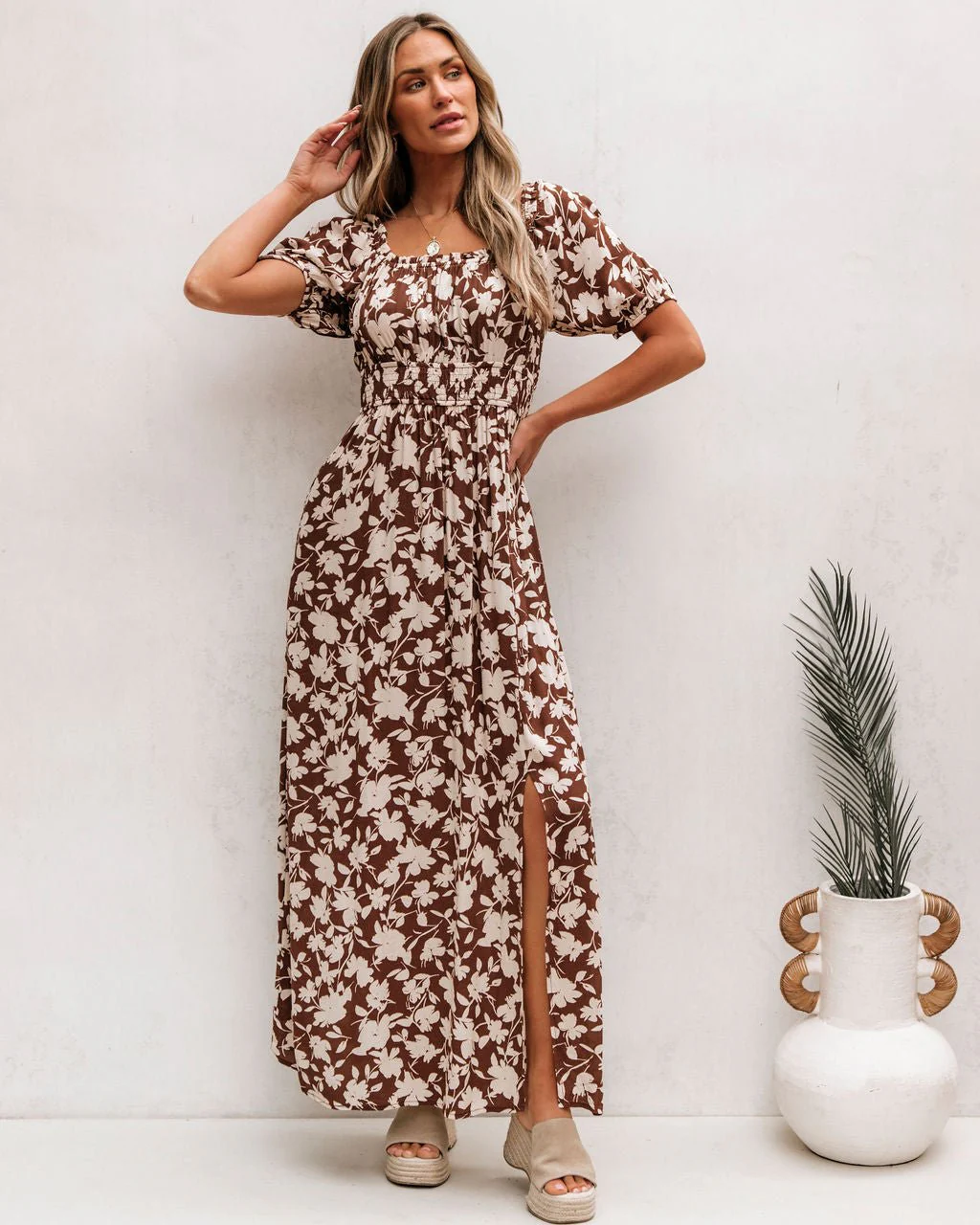 With its intricate details and flattering silhouette, this dress is perfect for a variety of occasions and is a must-have for any fashion enthusiast! Features include short puff sleeves, a square neckline, a ruched bust, cinched waist, side slit, and an allover floral print design. Style with flat sandals and a sunhat for a charming day out; or dress it up with strappy heels, statement earrings, and a clutch for an elegant evening event.