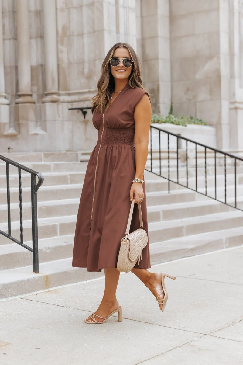 Cap Sleeve Smocked Front Zip Shirt Dress - Brown - FINAL SALE