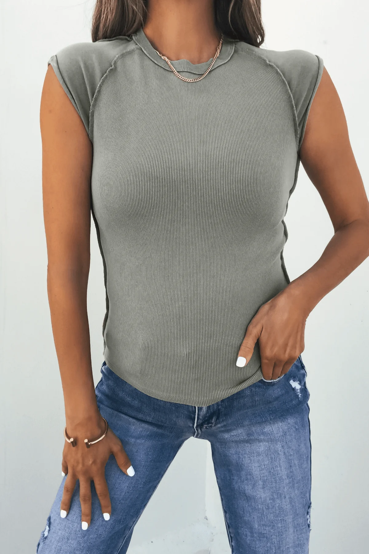 Crafted from soft and stretchy fabric, this slim-fit tee features cap-inspired sleeves and a classic crew neckline, making it perfect for layering or wearing solo. The ribbed texture and raised seam detail elevate its simplicity, giving it a touch of sophistication. Made for comfort and versatility, this top pairs beautifully with your favorite jeans, skirts, or shorts for an easy, on-the-go look.