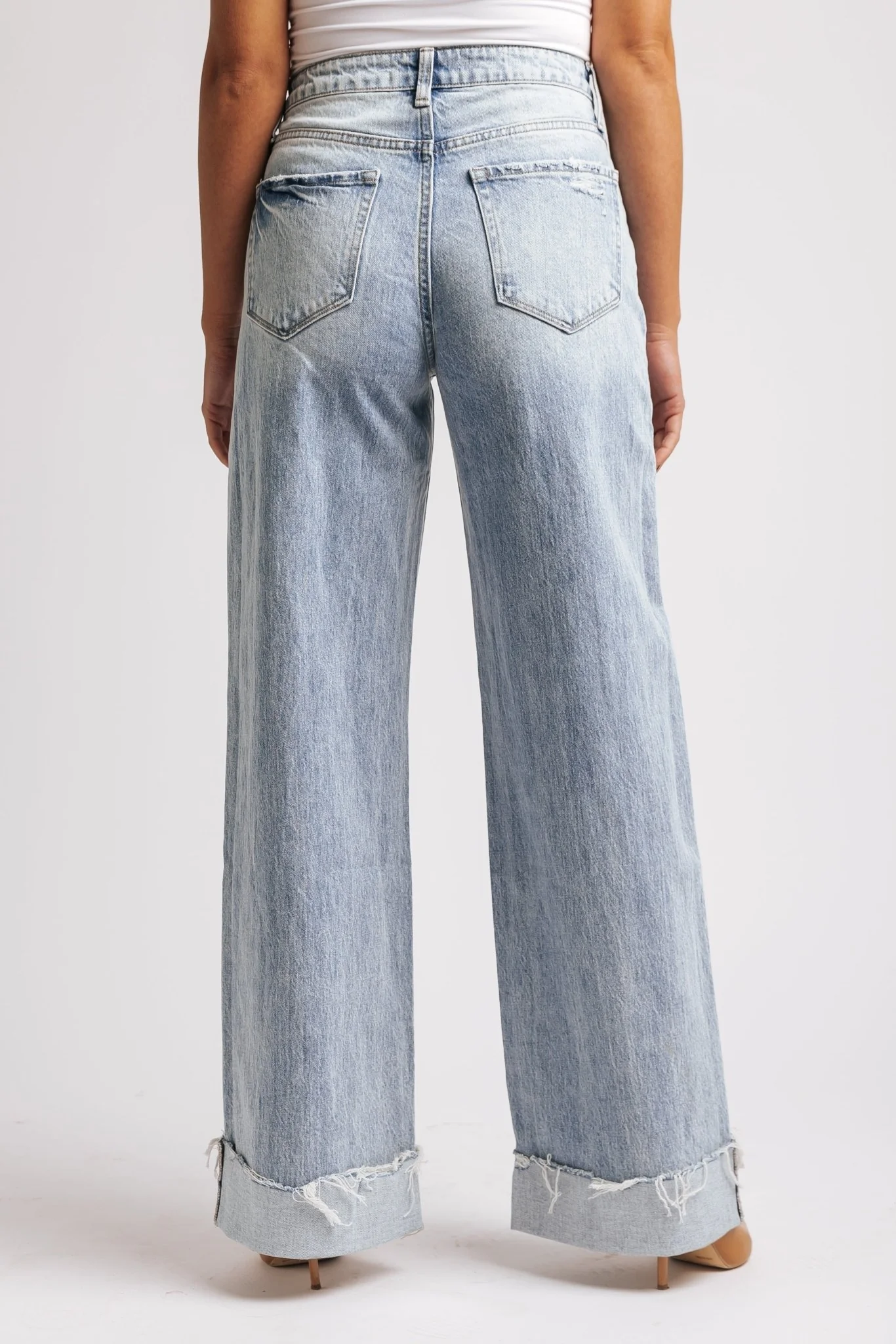 The Light Wash Baggy Cuffed Wide Leg Jeans feature a relaxed and trendy style with a high-rise waist and wide leg silhouette!
