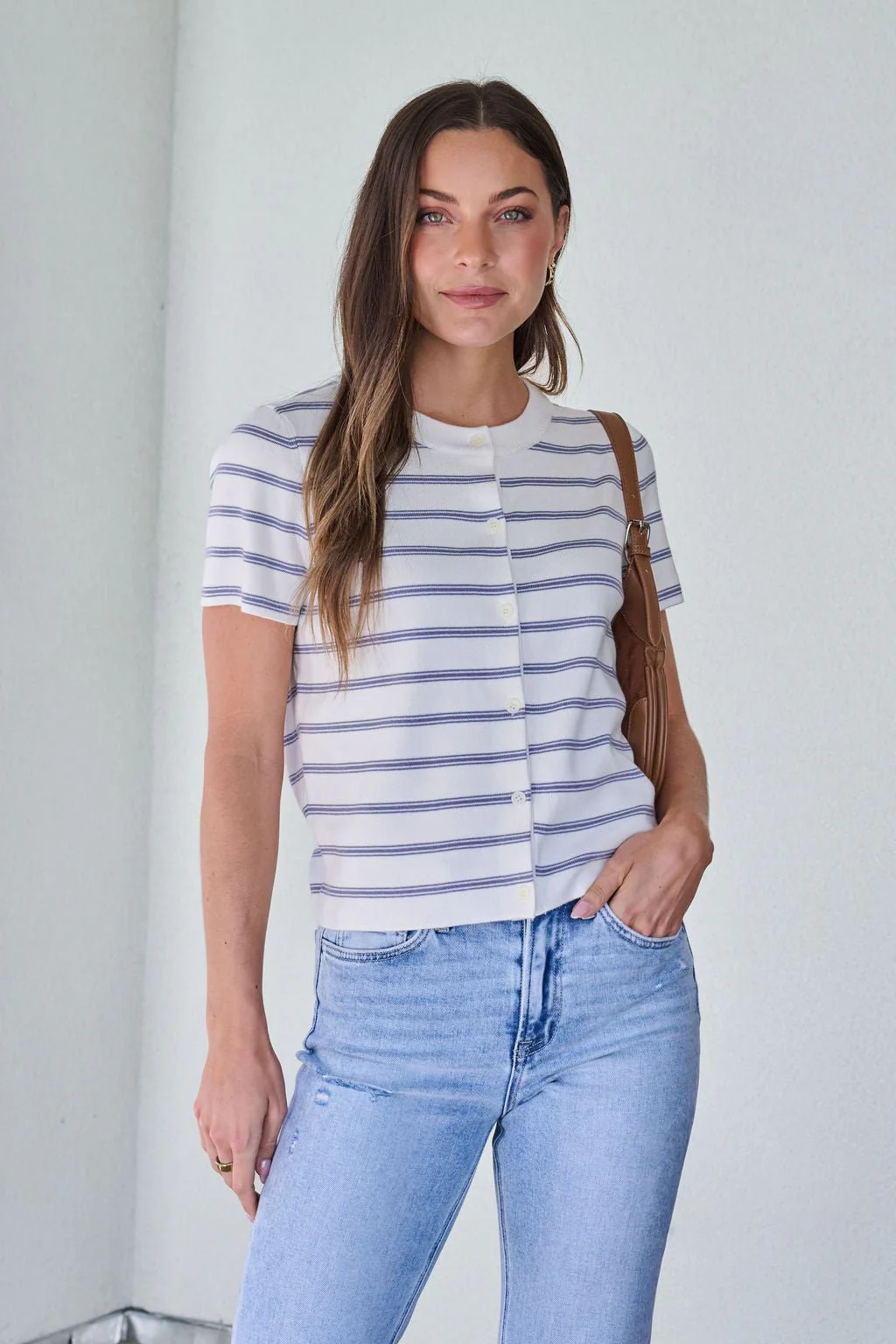 The Marina Stripe Cardigan brings a fresh, nautical‑inspired touch to your wardrobe with its lightweight feel and classic blue and white striping. Designed with a round neckline and subtle ribbed detailing, it offers a polished yet easygoing look that layers effortlessly through changing seasons. The soft viscose‑nylon blend provides a smooth, breathable fit, making this striped cardigan an essential piece for adding texture and timeless style to everyday outfits.