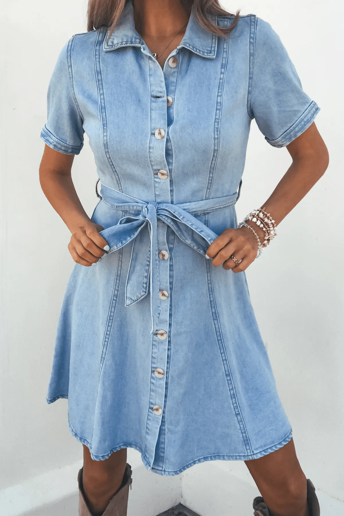 Easy, breezy, and endlessly wearable—the Skylar Belted Shirt Dress is your new daytime go-to. Made from soft, lightweight chambray, it features a collared neckline, short sleeves, and a button-down front for that classic shirtdress feel. The adjustable front tie adds shape and a flattering touch. Perfect for sunny days, weekend plans, or wherever you're headed next.