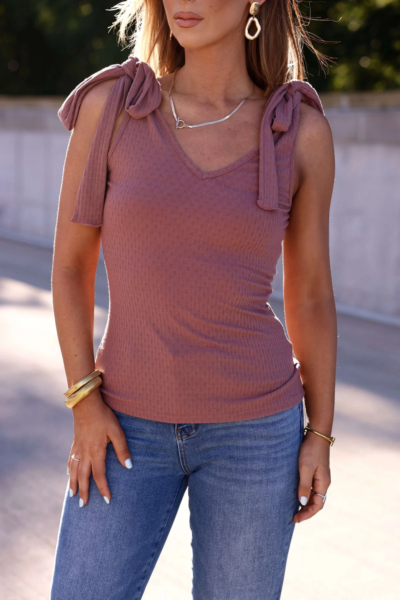 Sutton Ribbed Shoulder Tie Top - Mauve
